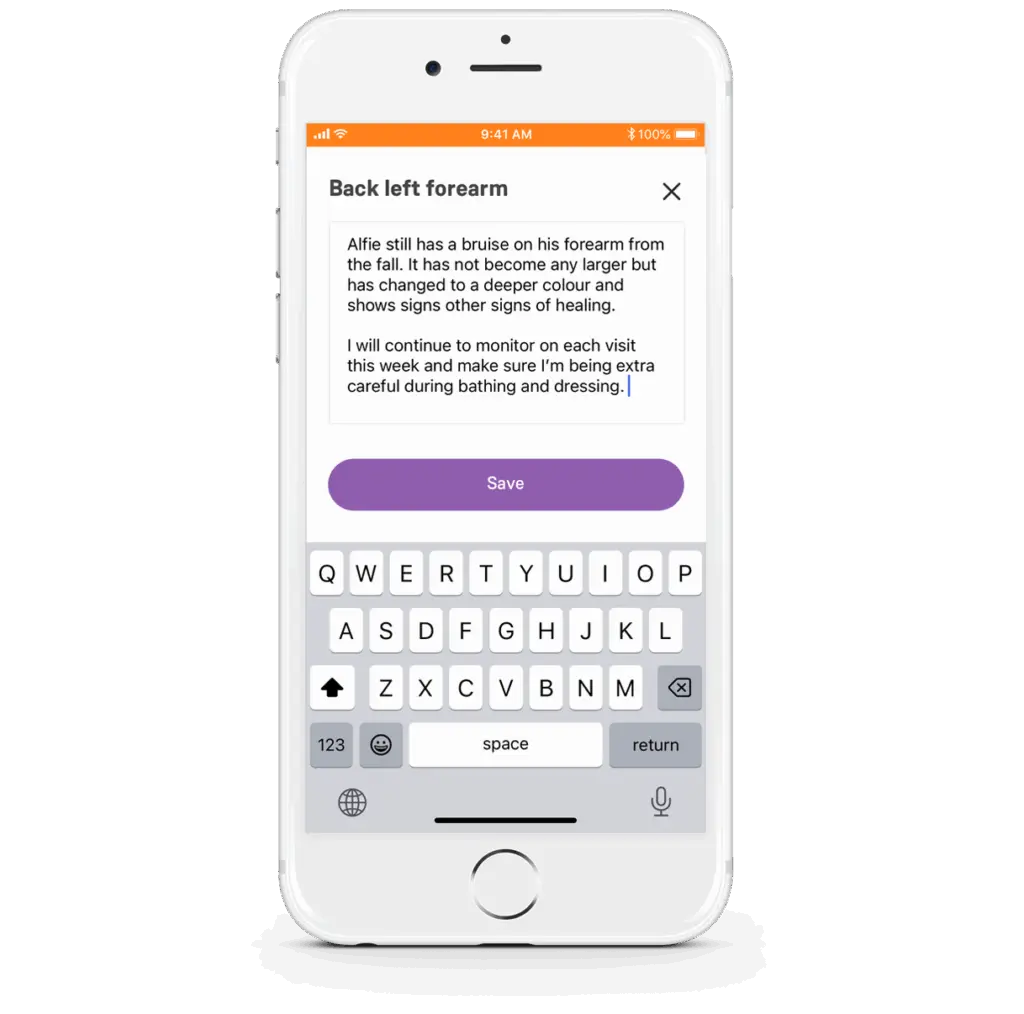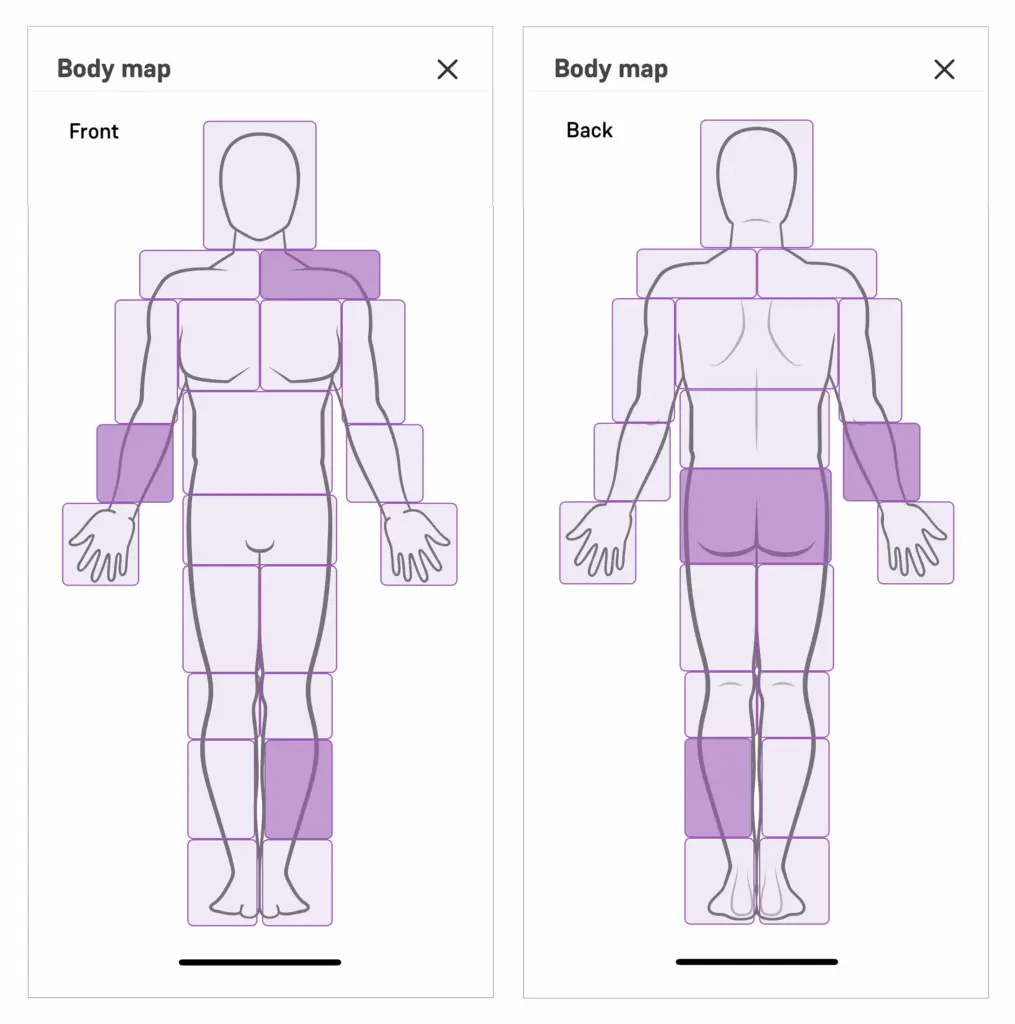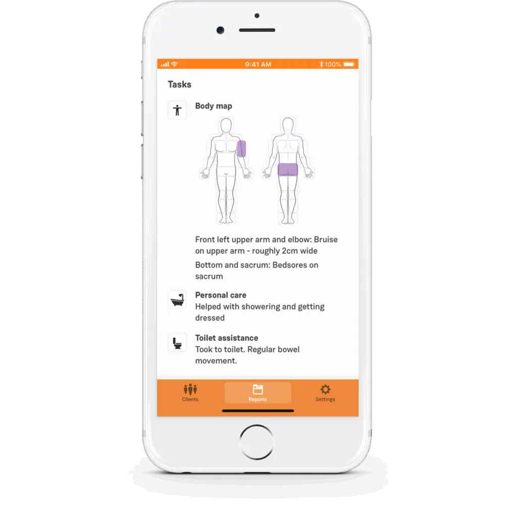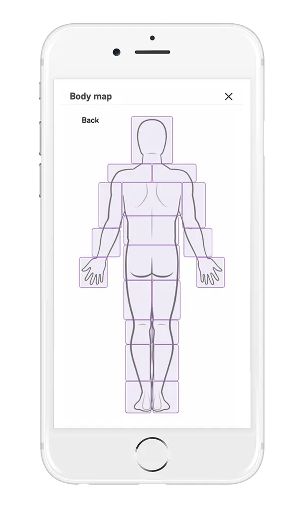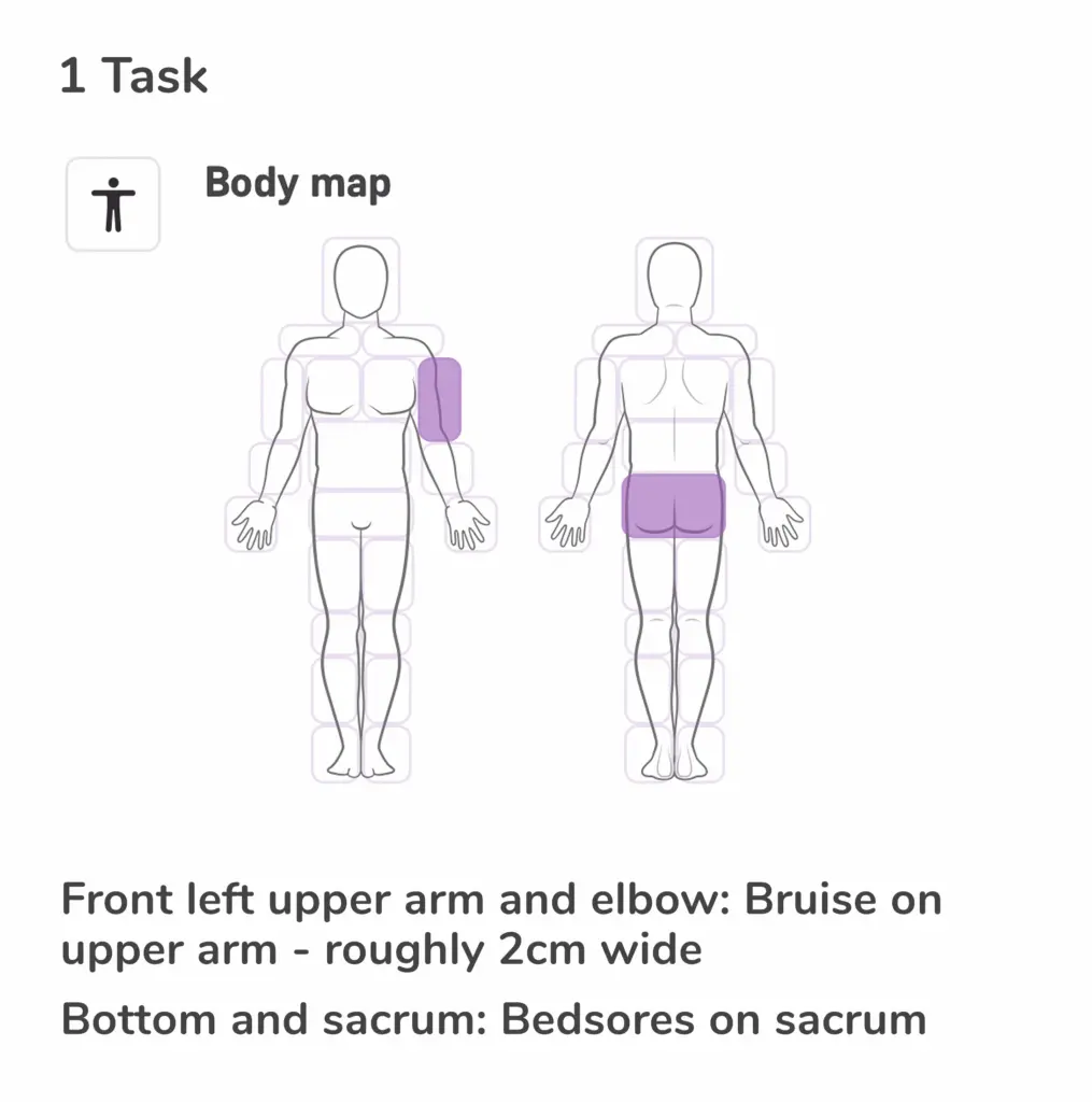 Care workers can select multiple body areas, front or back of the client's body, to leave notes about any observations (injuries, sores or wounds) or to leave notes about client rehabilitation related to the area of the body.