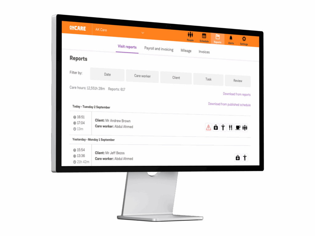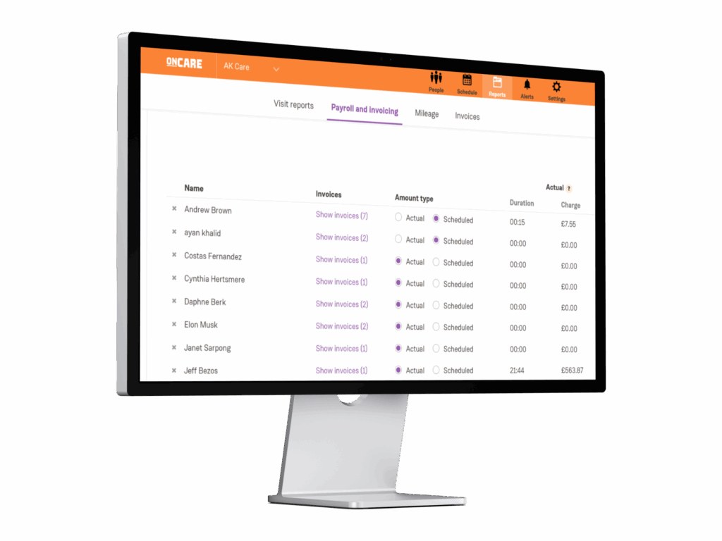 Generate invoices or payroll reports of multiple clients or care workers at once